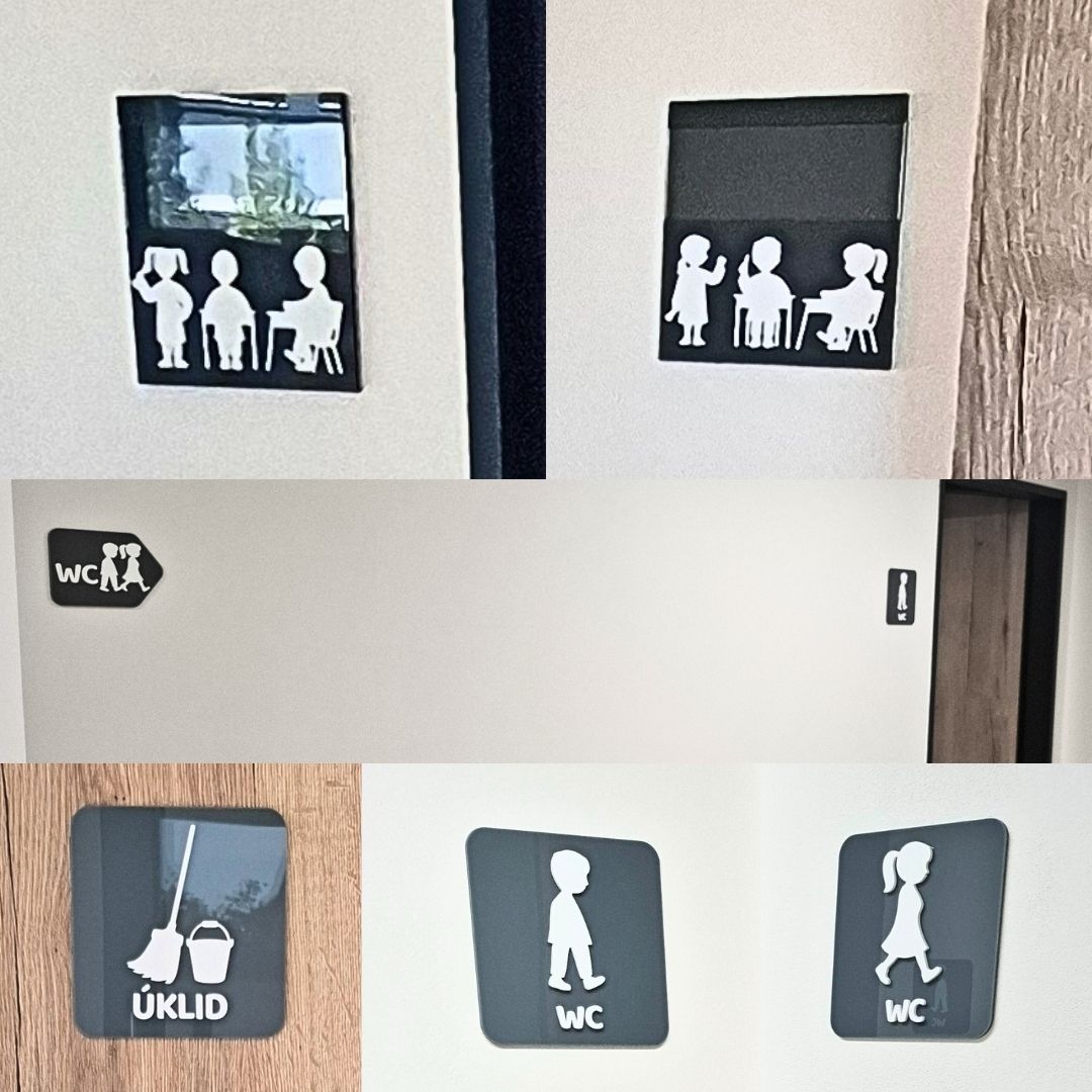 Kombinace barevných plexi cedulek s vrstvenou grafikou do základní školy